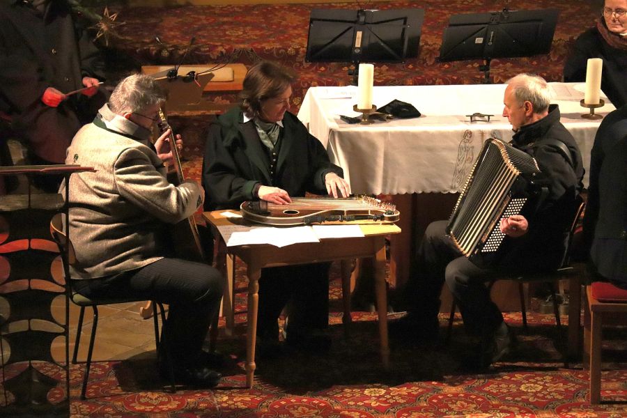 Mit den mystischen Klängen von Hans Wiesholzer am Akkordeon, Sepp Linhuber an der Gitarre und Lisbeth Genhammer an der Zither, konnte man sich die Rauhnächte regelrecht vor Augen halten. Das feine Gespür der drei Vollblutmusikanten verbreitete sich im ganzen Kirchenraum. Die Bankerl Musi hat ihren Ursprung durch das Bankerl Singen“ in Aschau mit der all zu früh verstorbenen Gabi Reiserer und Hans Wiesholzer. Mit diesem Erbe wurde Hans und Lisbeth alsbald beauftragt, mit Erfolg. Sepp Linhuber, schon jahrelang beheimatet in Aschau, verstärkt und unterstreicht nun den neuen Namen der Aschauer Bankerl Musi.