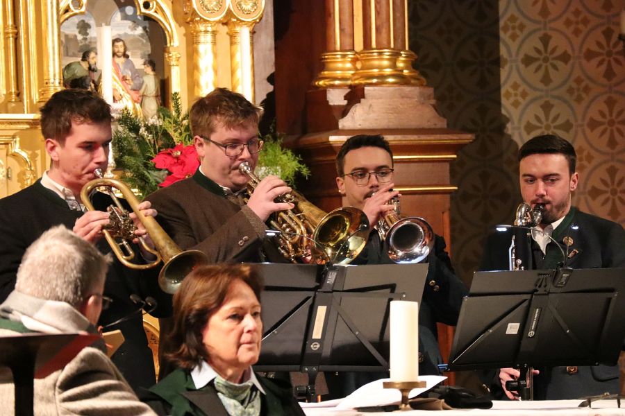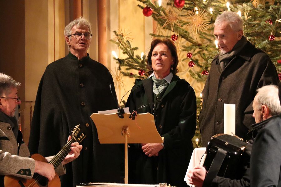 Einen Hl. Dreikönig Abend der besonderen Art erlebten Musik- und Mundartliebhaber beim alpenländischen Konzert in der Chieminger Pfarrkirche. Der Einladung gemeinsam Volksmusik zu erleben und sich an den Geschichten von Mundartautor Gustl Lex zu erfreuen, folgte eine große Besucherschar. Kaum noch ein Platz war zu finden, als das Programm mit einer Bläserweise pünktlich zum Glockenschlag um 19 Uhr begann. Anlass zu diesem Konzert war das 30-jährige Jubiläum des Sänger- und Musikantenhoagarts des Heimathauses Chieming, das seit 1996 immer um den Feiertag stattfindet. Einige Musikanten von der mitwirkenden SeeOderBerg Musi, mit den beiden Familien Baumgartner und Wallner, spielten bereits damals in einer Tanzlmusi zusammen und wollten mit befreundeten Gruppen einen volksmusikalischen Abend verbringen. Hubert Steiner, Vorstand des Heimatvereins, stellte der damaligen Wetzstoa-Tanzlmusi den Gewölbesaal zur Verfügung und kümmerte sich seither mit Verwandten und Freunden um das leibliche Wohl. Dieses Jahr sollte es anders sein und die Musikanten um Tochter Bärbel Baumgartner luden die Helfer und all die treuen Zuhörer in die Kirche zum Genießen ein. Die SeeOderBerg Musi fand sich vor etwa 5 Jahren in dieser neuen Formation zusammen. Irmi Wallner und Bärbel Baumgartner musizieren seit ihrer Kinder- und Jugendzeit in verschiedenen Gruppen miteinander und so fügten sich die vier Bläserstimmen der Familie Baumgartner aus Oderberg mit der Ziach- und Harfenbegleitung von den Wallners aus Chieming am See, so entstand auch die Zusammensetzung des Gruppennamens, zueinander. Für diesen Konzert-Abend gesellte sich auch Irmi´s Schwester, Christine Guggenberger mit ihrem Kontrabass hinzu. Die Weisenbläsergruppe mit Markus Baumgartner am Flügelhorn, Lukas Baumgartner an der Bassklarinette und Wasti Wallner am Bassflügelhorn, wurde durch Toni Wallner am Flügelhorn als Quartett vervollständigt.